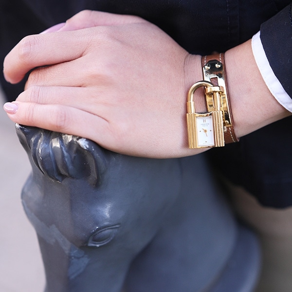 「バッグの象徴『カデナ』が時計に」 世界中の女性を虜にするバッグ「ケリー」に付属するカデナ(南京錠)をモチーフにした、極めて独創的なタイムピースです。手首の動きに合わせてカデナが軽やかに揺れる様は、時計の枠を超えたジュエリーのようなエレガンスを漂わせます。ストラップから取り外してチャームとして活用できるなど、エルメスらしい自由な遊び心が凝縮されています。