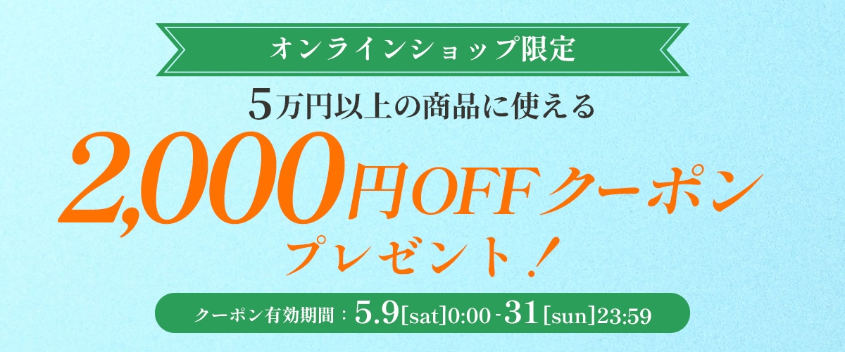 期間中、オンラインショップ限定で5万円以上の商品に使えるクーポンをプレゼントいたします。LINE友だち登録いただいている方へ配信いたしますので、ぜひこの機会に友だち登録をお願いいたします。ご利用方法や注意事項についても配信メッセージ内に記載しておりますので、ご利用の際はよく読んでからお使いください。