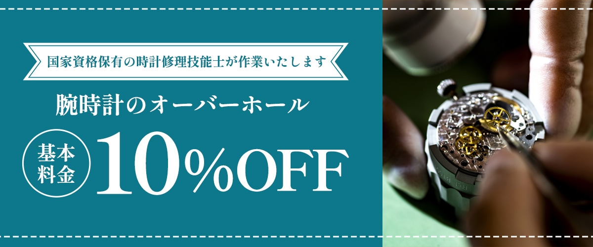 キャンペーン全期間で、店頭の腕時計のオーバーホール代金を基本料金から10%OFFにてご提供いたします。詳細や料金シミュレーションについては下記ページをご覧ください。